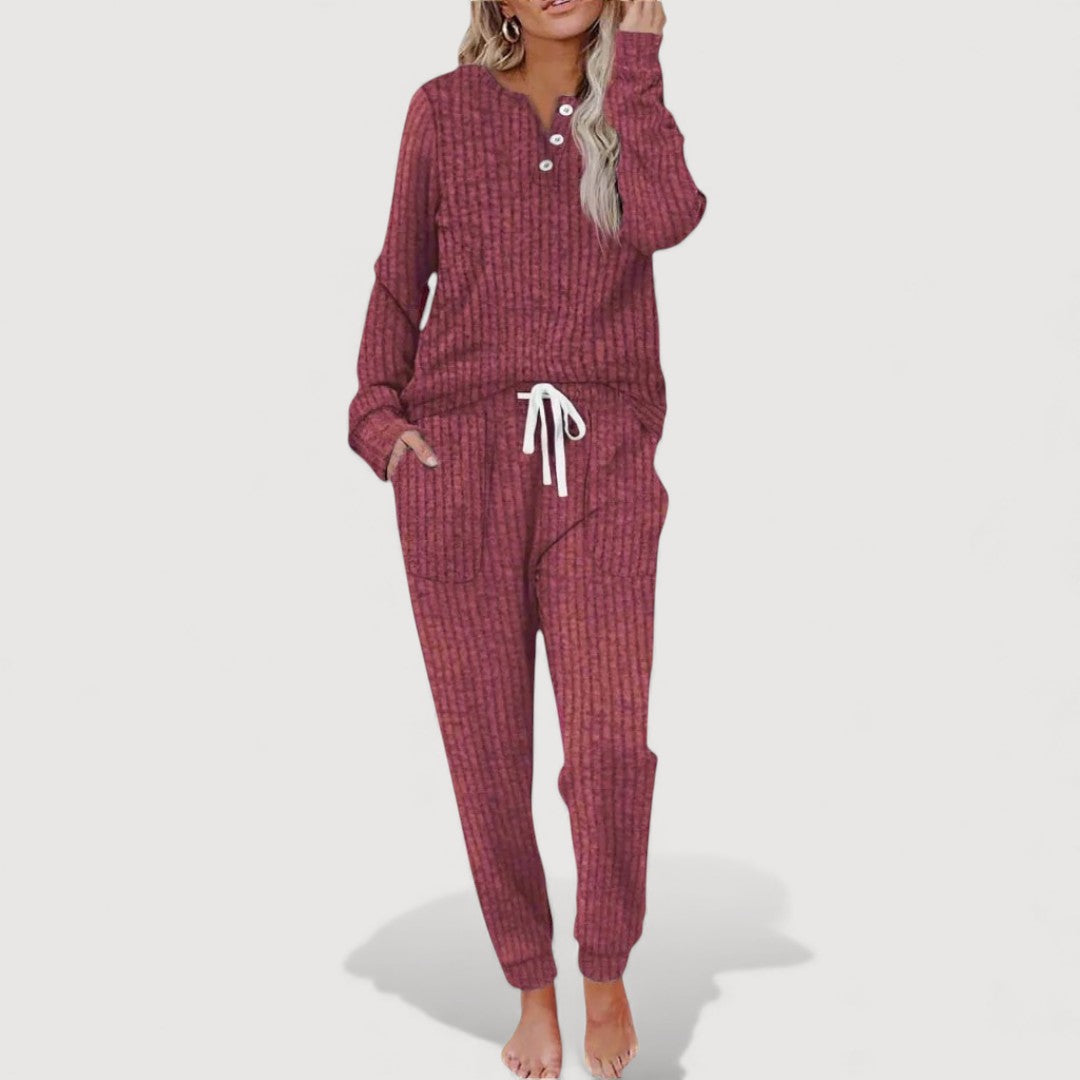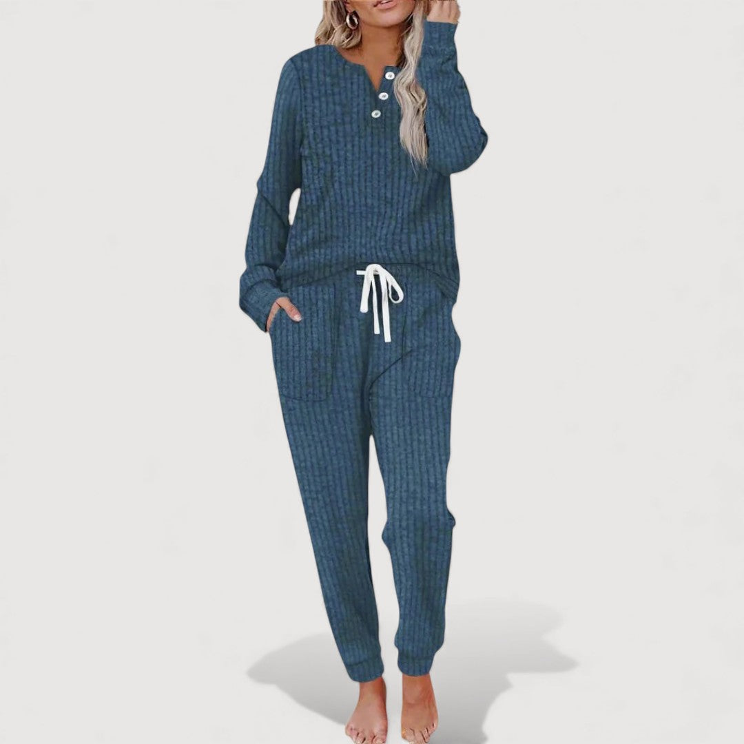 Sol Lounge Set is designed for relaxed days when comfort and effortless style matter most. The softly structured top pairs beautifully with matching trousers, creating a coordinated look that feels easy yet put-together. Thoughtful details allow freedom of movement while maintaining a flattering, grown-up silhouette. Ideal for quiet mornings at home or casual days out, this set quickly becomes a wardrobe favourite.